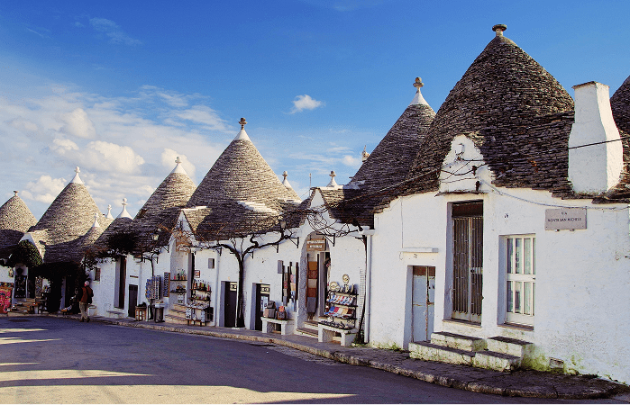 Alberobello è un comune italiano nella città metropolitana di Bari, in Puglia, famoso per i suoi trulli, abitazioni in pietra con tetti conici. Questi trulli, che sono il simbolo dell'architettura rurale pugliese, sono stati dichiarati Patrimonio dell'Umanità dall'UNESCO secondo Italia.it. Alberobello si trova nella Valle d'Itria, a circa 50 chilometri da Bari.